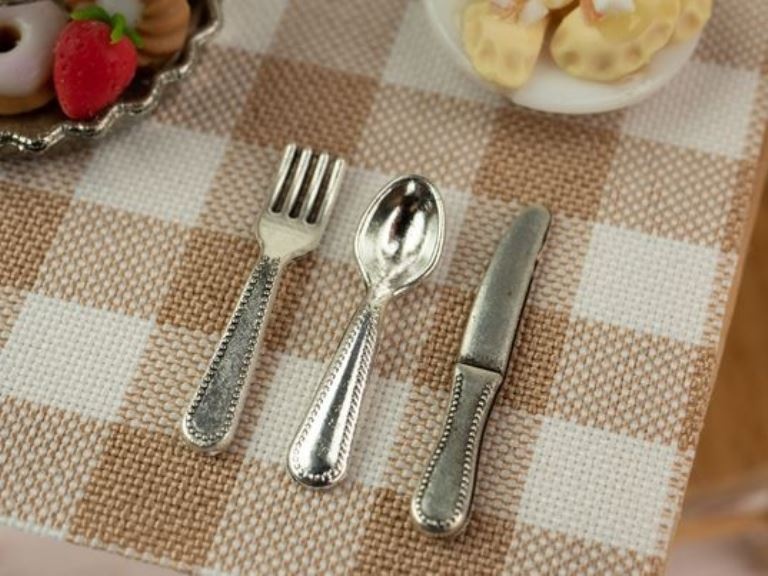 Zestaw obiadowy mini sztućcy w kolorze srebrnym ; łyżka do zupy o długości 19mm ,widelec o długości 20mm , nóż o długości 21mm .