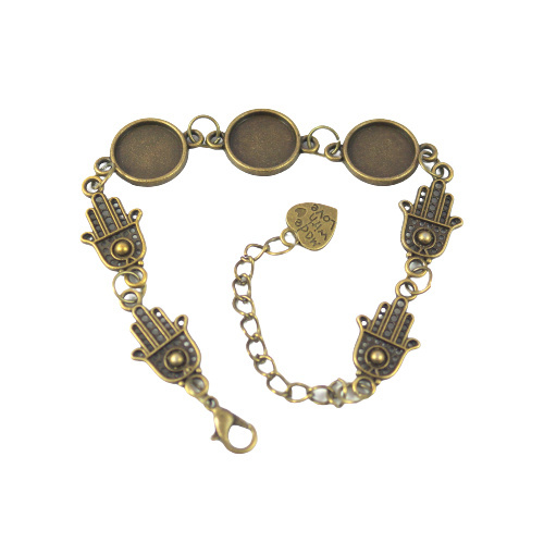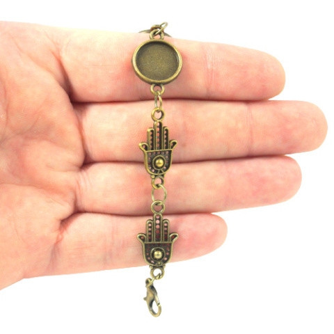 Baza bransoletki do wklejenia 3 kaboszonów o średnicy 12 mm, w kolorze starego złota , długość całkowita bransoletki 24 cm, bransoletka wykończona 5 zawieszkami .