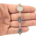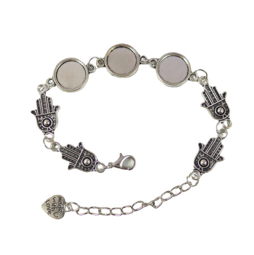 Baza bransoletki do wklejenia 3 kaboszonów o średnicy 12 mm, w kolorze srebrnym , długość całkowita bransoletki 21 cm, bransoletka wykończona 5 zawieszkami w kształcie ręki Fatimy i serca.