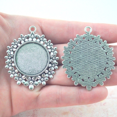 Baza wisiorka do kaboszona 25 mm , w kolorze srebrnym , wykonana z metalu bezołowiowego . Średnica całkowita 42 mm.