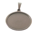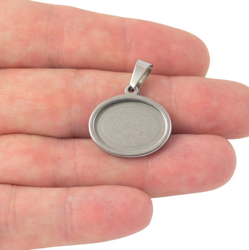 Baza wisiorka do kaboszona owalnego ,wykonana ze stali nierdzewnej, Wymiary kaboszona 13x18 mm. Wymiary zewnętrzne (bez ruchomej krawatki) : 21x19x2,2 mm.