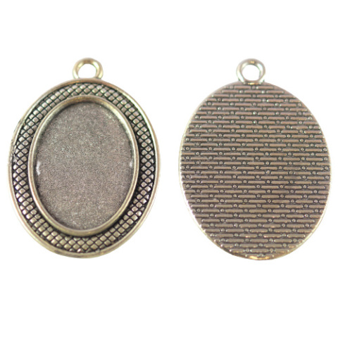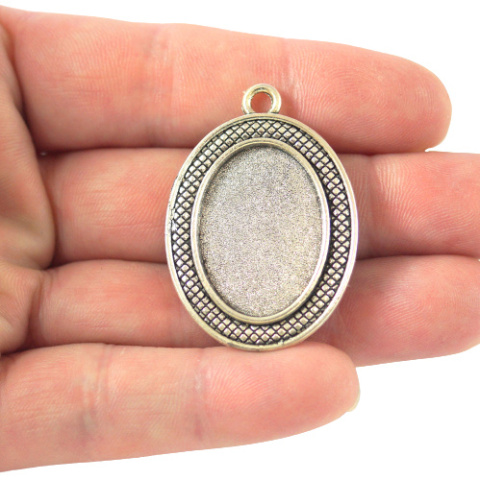 Baza wisiorka do kaboszona owalnego w kolorze srebrnym, Wymiary kaboszona 18x25 mm. Wymiary zewnętrzne : 39x28x2,2 mm.