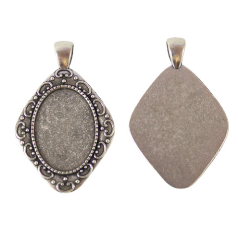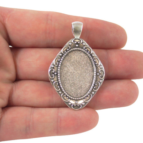 Baza wisiorka do kaboszona owalnego w kolorze srebrnym, Wymiary kaboszona 18x25 mm. Wymiary zewnętrzne : 46x29x2,3 mm.