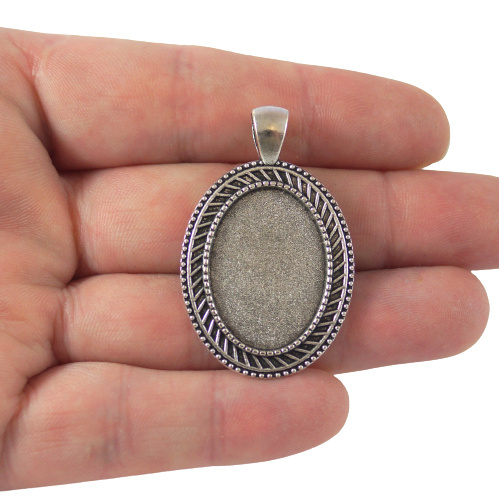 Baza wisiorka do kaboszona owalnego w kolorze srebrnym, Wymiary kaboszona 18x25 mm. Wymiary zewnętrzne : 42x27x2,3 mm.
