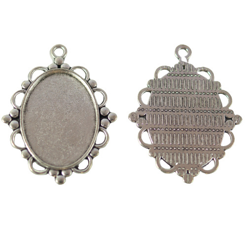 Baza wisiorka do kaboszona owalnego w kolorze srebrnym, Wymiary kaboszona 18x25 mm. Wymiary zewnętrzne : 38x29x2,3 mm.