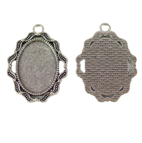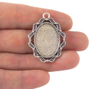 Baza wisiorka do kaboszona owalnego w kolorze srebrnym, Wymiary kaboszona 18x25 mm. Wymiary zewnętrzne : 38x29x2,8 mm.