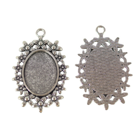 Baza wisiorka do kaboszona owalnego w kolorze srebrnym, Wymiary kaboszona 18x25 mm. Wymiary zewnętrzne : 49x31x2,5 mm.