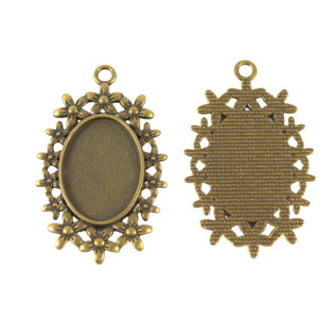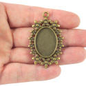 Baza wisiorka do kaboszona owalnego w kolorze starego złota, Wymiary kaboszona 18x25 mm. Wymiary zewnętrzne : 49x31x2,5 mm.