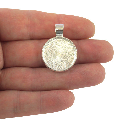 Baza wisiorka do kaboszona w kolorze srebrnym o średnicy 20 mm, średnica zewnętrzna 23 mm.