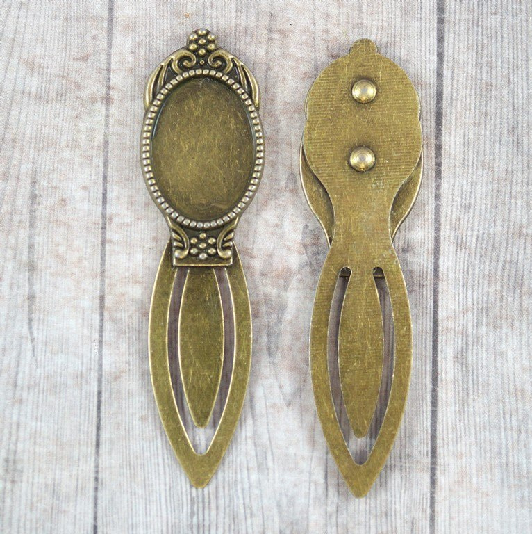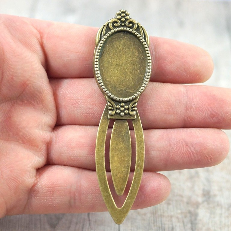 Baza zakładki do książki pod kaboszon owalny 25x18 mm ,w kolorze starego złota o długości 80 mm.