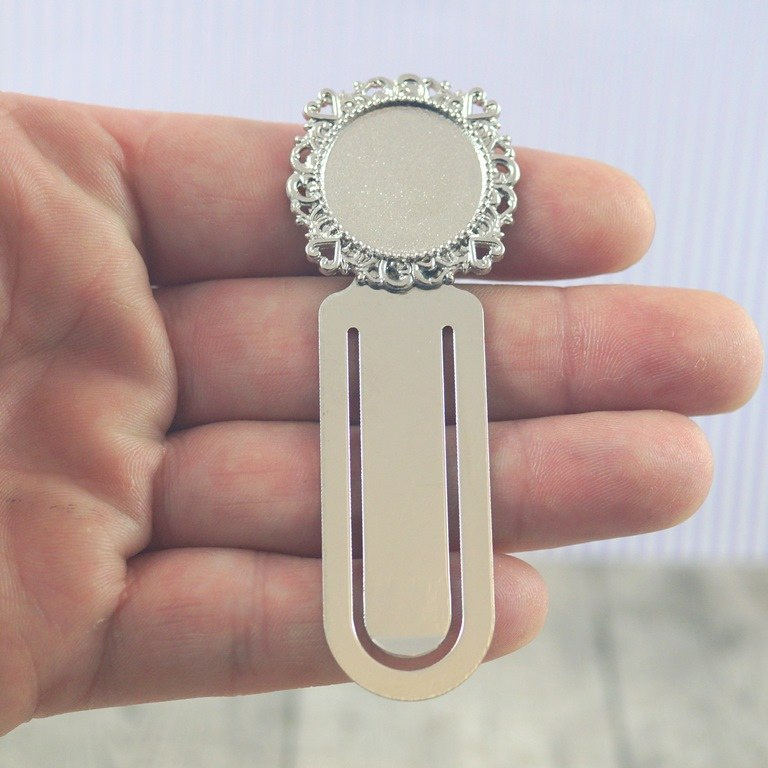 Baza zakładki do książki pod kaboszon w kolorze srebrnym o długości 80 mm , średnica wewnętrzna pod kaboszon 20 mm.