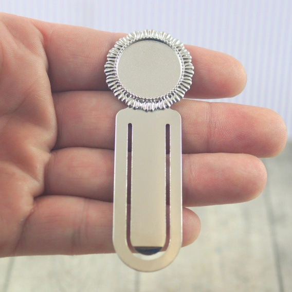 Baza zakładki do książki pod kaboszon w kolorze srebrnym o długości 90 mm , średnica wewnętrzna pod kaboszon 20 mm.