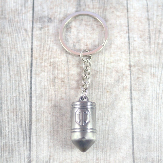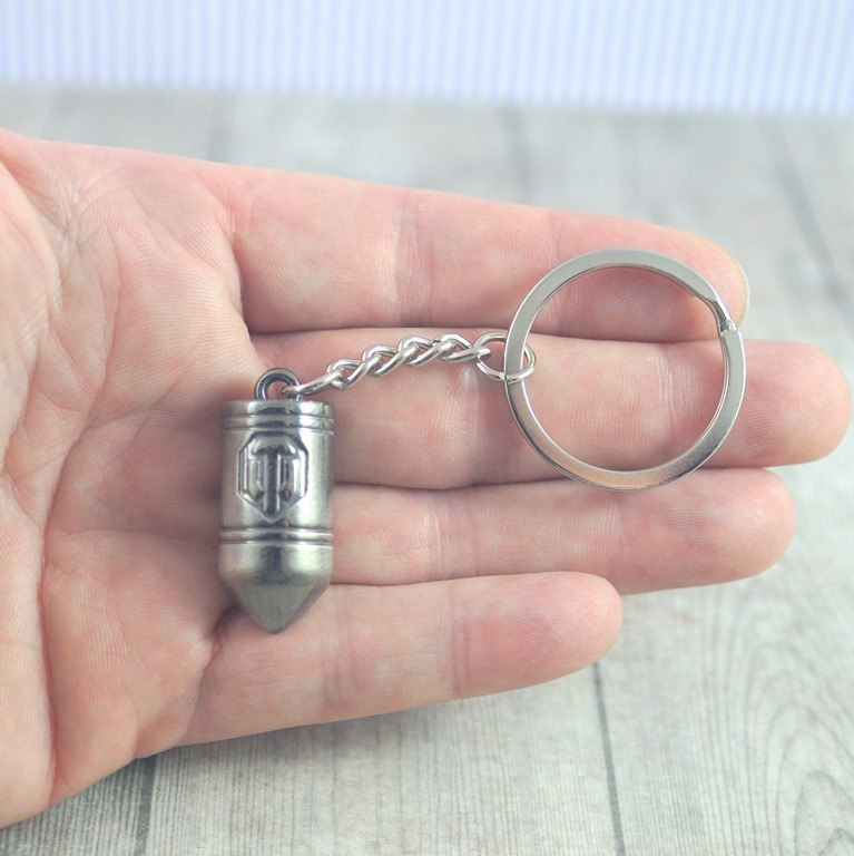 BRELOK WORLD OF TANKS w kolorze stalowym , wykonany ze stopu aluminium. Wymiary : wysokość 29 mm , średnica 14 mm.
