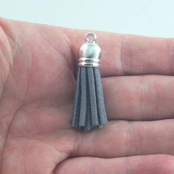 Chwost zawieszka z rzemienia zamszowego w kolorze grafitowym ,z końcówką w kolorze srebra , długość całkowita z końcówką metalową 38 mm, długość rzemienia 24 mm ,średnica końcówki 10 mm