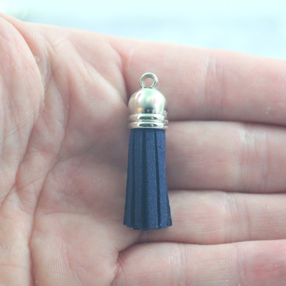 Chwost granatowy -zawieszka z rzemienia zamszowego z końcówką w kolorze srebra , długość całkowita z końcówką metalową 38 mm, długość rzemienia 24 mm ,średnica końcówki 10 mm