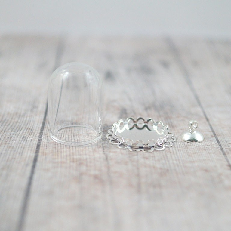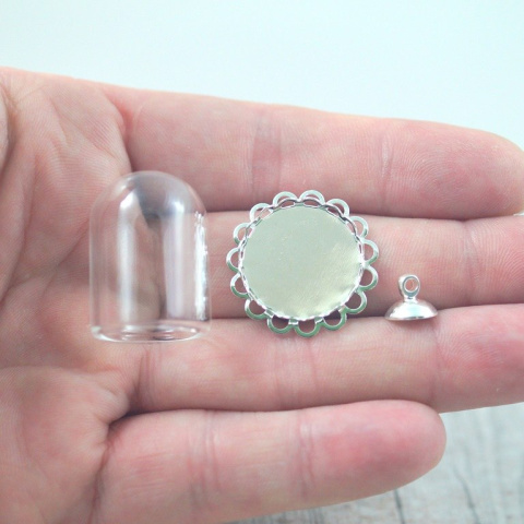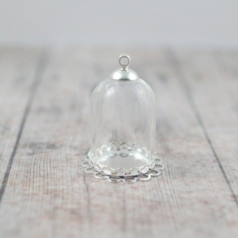 kopułka szklana o wymiarach :wysokość 25 mm, średnica 18 mm, podstawa w kolorze srebrnym ,zawieszka o średnicy 8 mm.