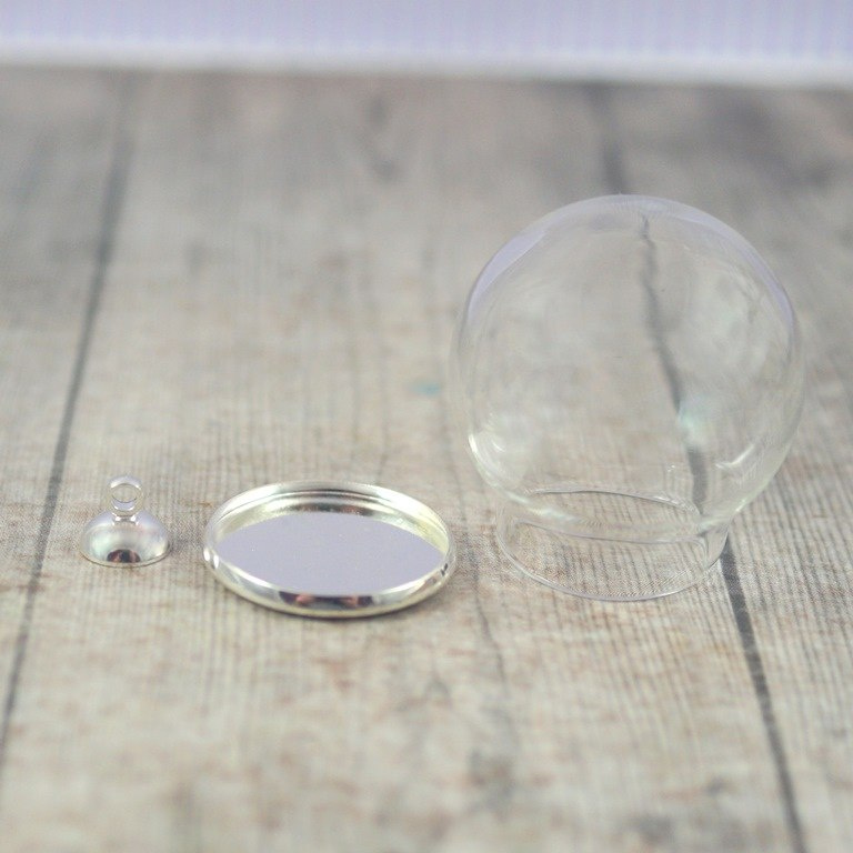 Zestaw zawiera kulę szklaną o średnicy 30 mm, metalową czapeczkę w kolorze srebrnym o średnicy 8 mm , metalową podstawę o średnicy wewnętrznej 20 mm. Suszone modrakowe kwiatki do wypełnienia kuli - gratis.