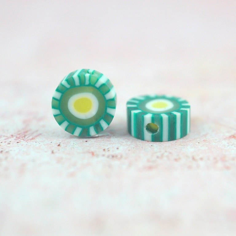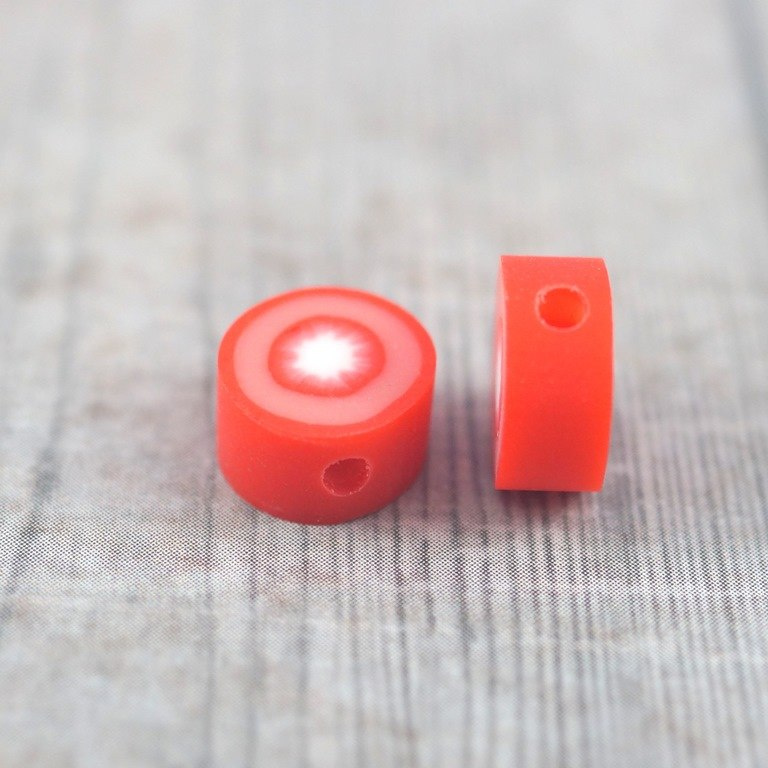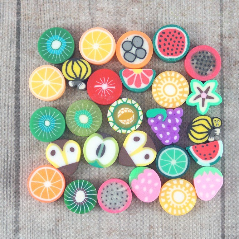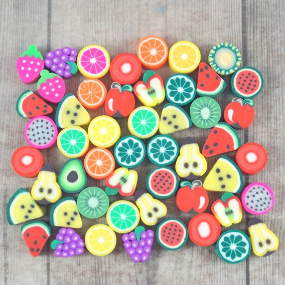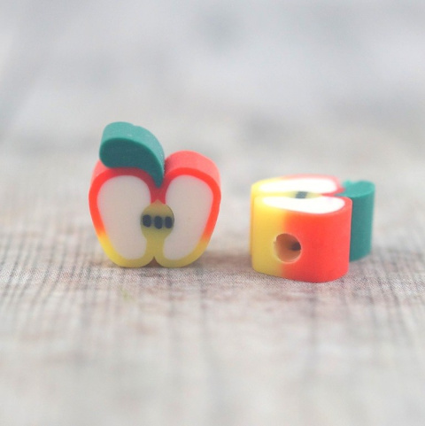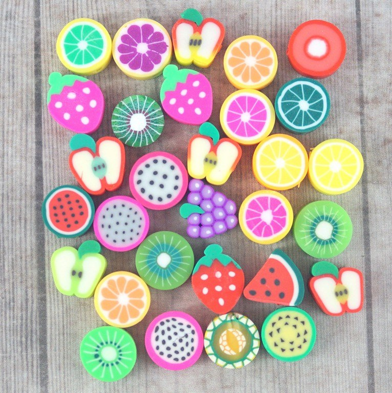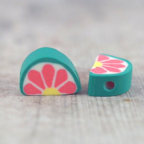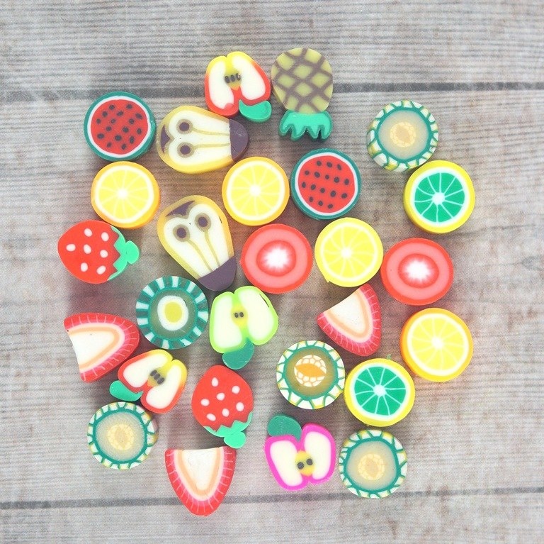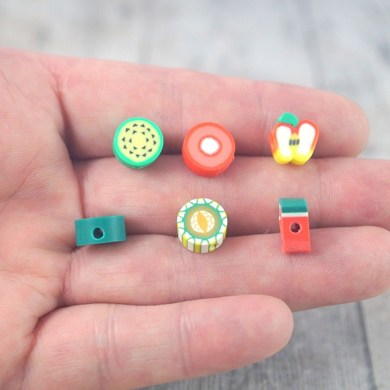 Koralik z modeliny FIMO  mix kolorowych i smacznych owoców 40 szt. (jabłka ,truskawki ,pomarańcze ,mango ,cytryna ,kiwi ,arbuz, ogórek, pomidor ,poziomka .jagoda . jeżyna , awokado. )średnica około 10 mm  , grubości 4-5 mm   cena za 40 sztuk (koraliki posiadają otwór do nawlekania o średnicy 1,5 mm )