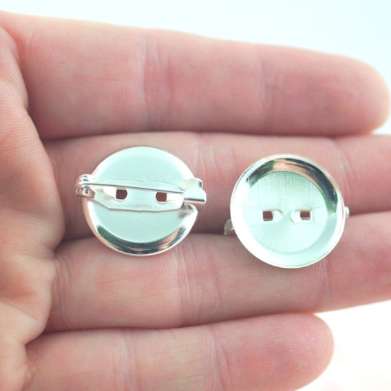 Mała baza broszki wykonana z metalu w kolorze srebrnym, okrągła o średnicy 19 mm , wymiary zapięcia 5x20 mm