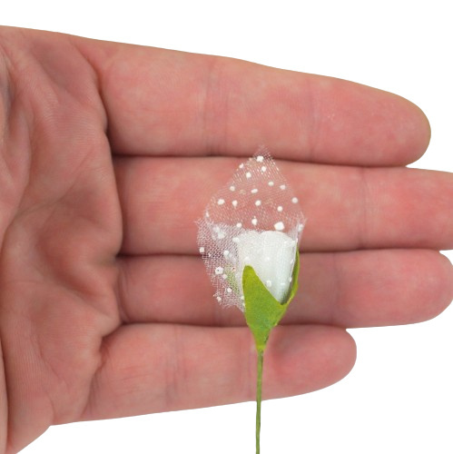 Mini różyczka biała z tiulem , wymiary pączka : wysokość 16 mm ,średnica 12 mm , wykonane z tworzywa sztucznego i papieru, cena za 1 sztukę .