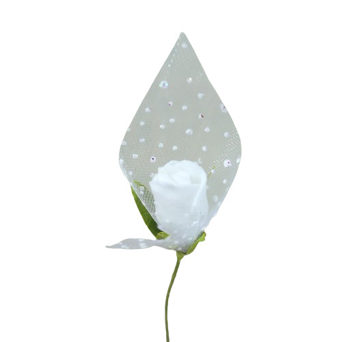 Mini bukiet białych róż z tiulem , wymiary pączka : wysokość 16 mm ,średnica 12 mm , wykonane z tworzywa sztucznego i papieru, cena za 3 sztuki. .