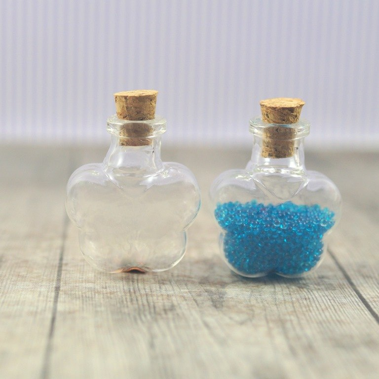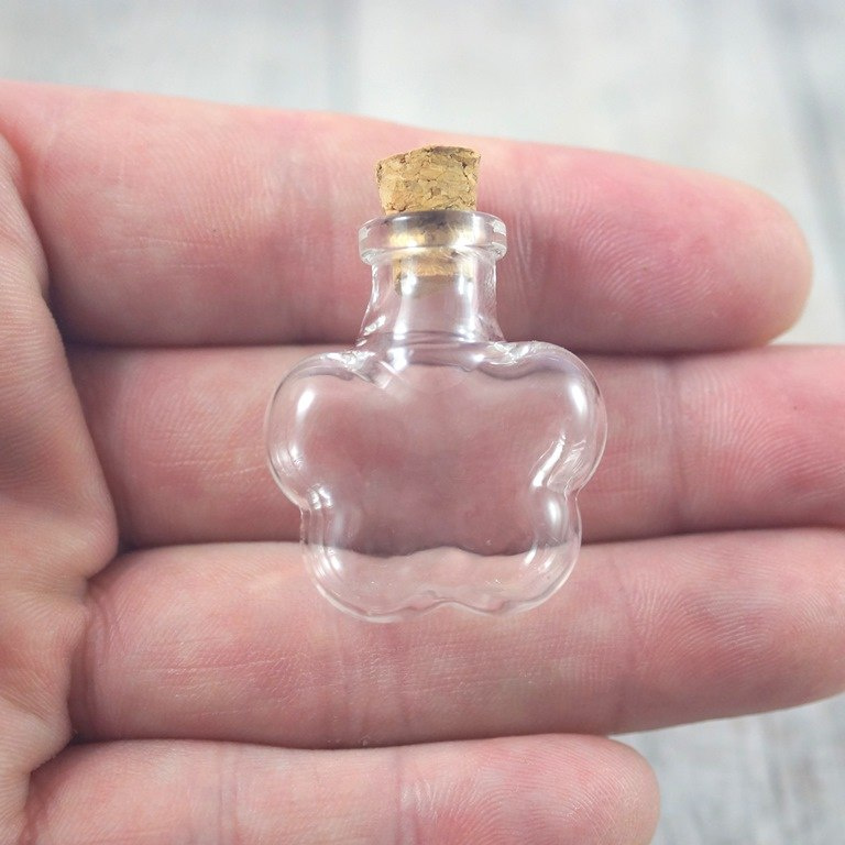 Mini buteleczka szklana kwiatek , wymiary bez korka: 32x27x16 mm.