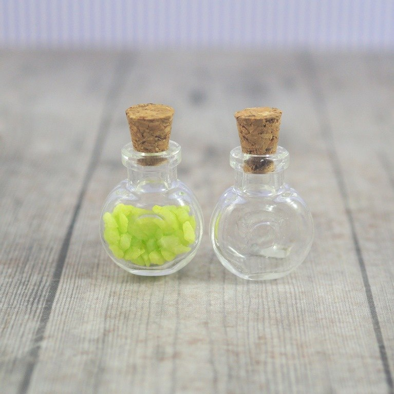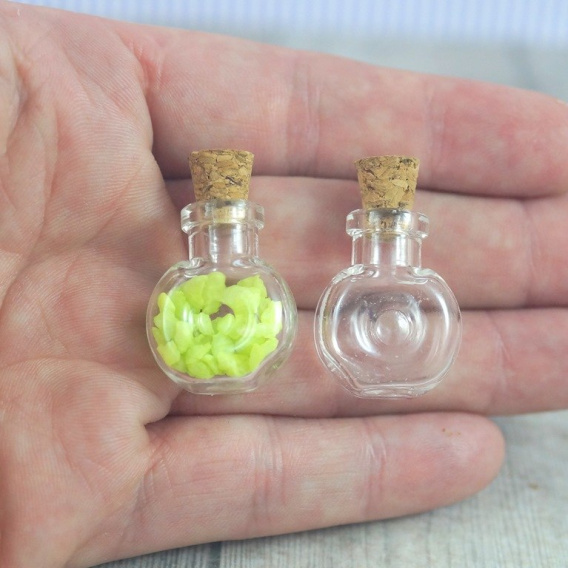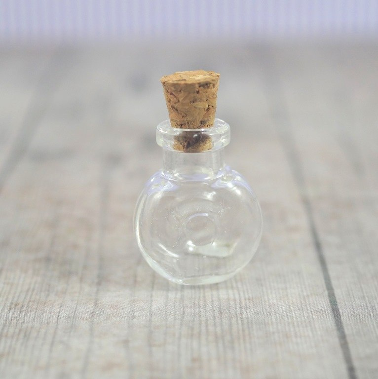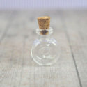 Mini buteleczka szklana okrągła spłaszczona z wgłębieniem i  korkiem ,wysokość bez korka 24 mm,szerokość 20 mm ,grubość 11 mm ,średnica otworu wlotowego 6 mm .