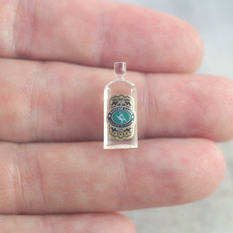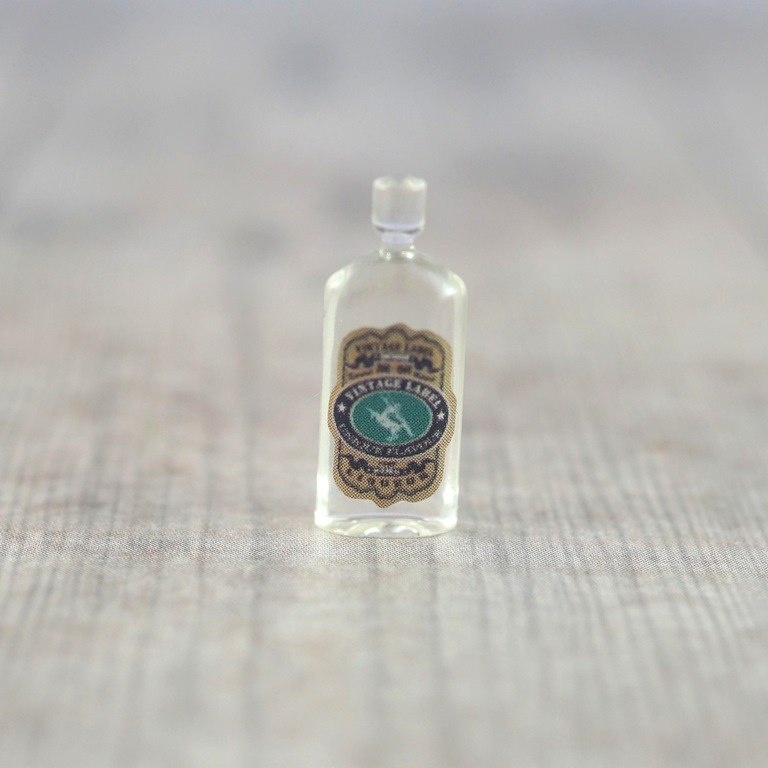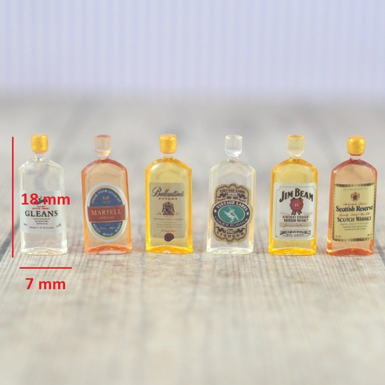 Miniaturowa butelka whisky (piersiówka) wykonana z żywicy , o wymiarach : 18x7x4 mm. Bardzo realistycznie wykonana naklejka , buteleczka ma przekrój eliptyczny , skala domku dla lalek 1:12. Cena za 1 szt.