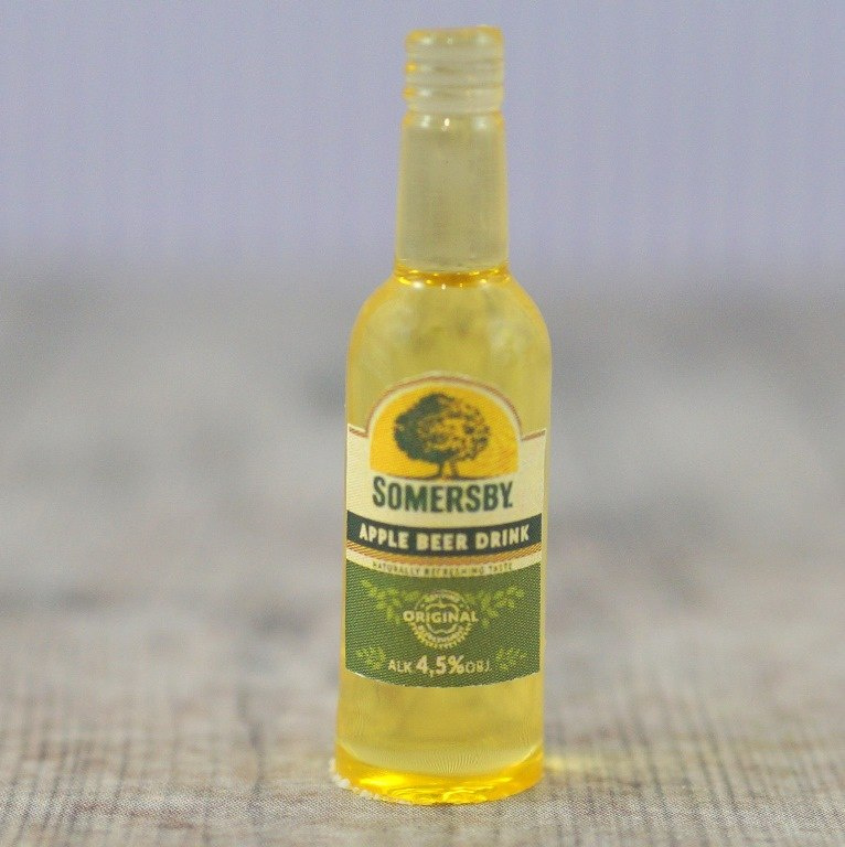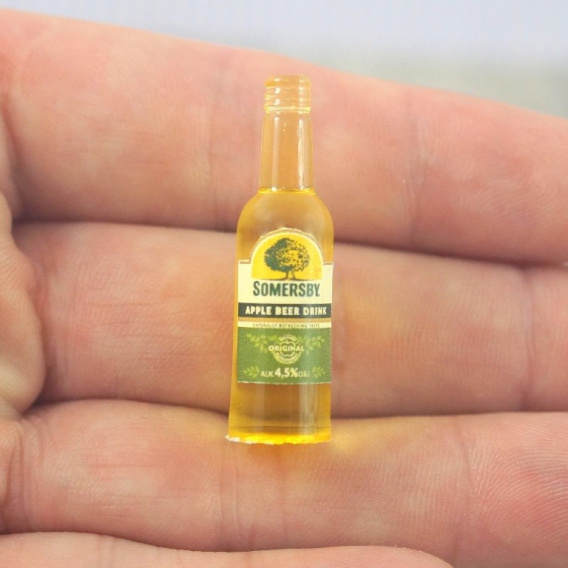 Miniaturowa butelka piwa wykonana z żywicy ,wymiary :wysokość 35 mm,średnica 10 mm. Do wykorzystania jako wyposażenie domku dla lalek (skala 1:12) lub jako breloczek , kolczyki.
