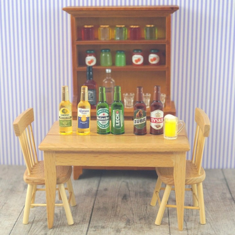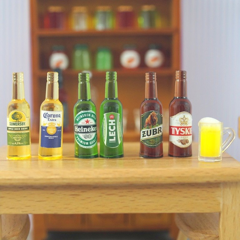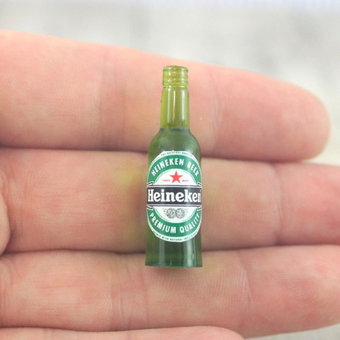Miniaturowa butelka piwa wykonana z żywicy ,wymiary :wysokość 35 mm,średnica 10 mm. Do wykorzystania jako wyposażenie domku dla lalek (skala 1:12) lub jako breloczek , kolczyki.