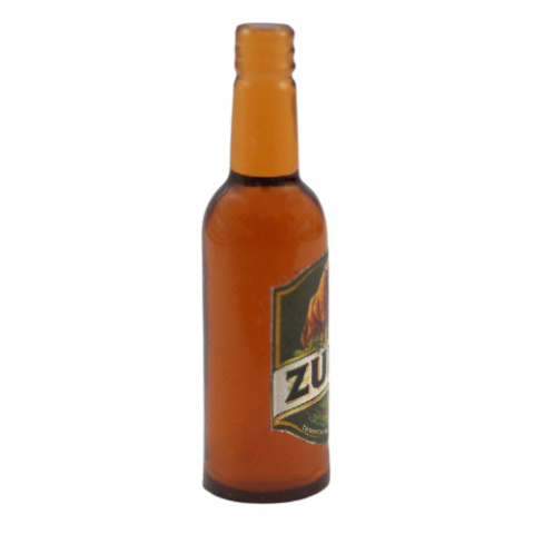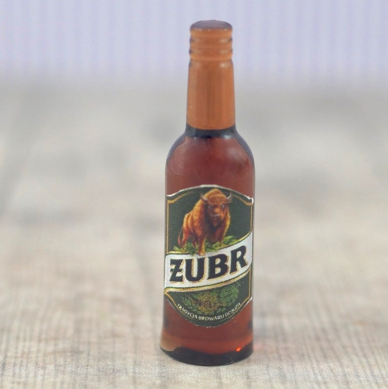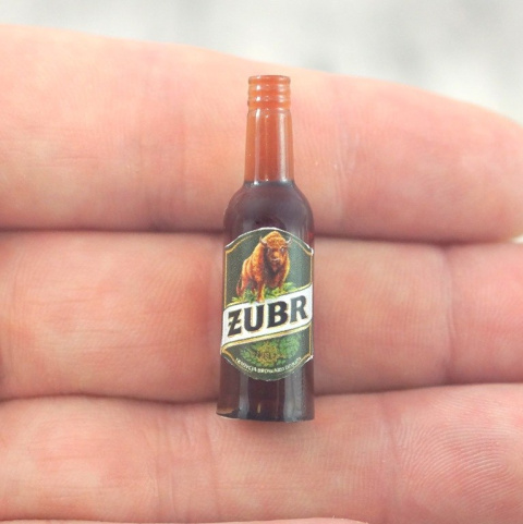Miniaturowa butelka piwa wykonana z żywicy ,wymiary :wysokość 35 mm,średnica 10 mm. Do wykorzystania jako wyposażenie domku dla lalek (skala 1:12) lub jako breloczek , kolczyki.