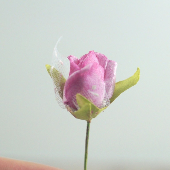 Mini różyczka ciemnoróżowa z tiulem o wymiarach pączka : 19x16 mm , nadają się idealnie do wypełniania kaboszonów szklanych