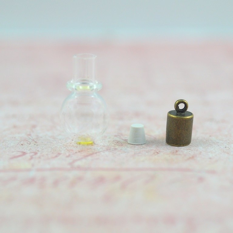 zestaw zawiera 1 szt fiolka szklana ,1szt gumowy koreczek ,1 szt. metalowa końcówka w kolorze starego złota.