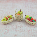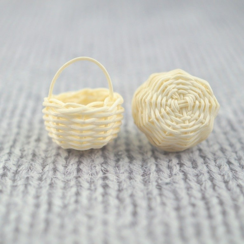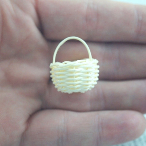 Mini koszyczek wykonany ręcznie z rattanu , wymiary bez pałączka : wysokość 14 mm , średnica 22 mm , całkowita wysokość 22 mm. Miniatura do domku dla lalek w skali 1:12.