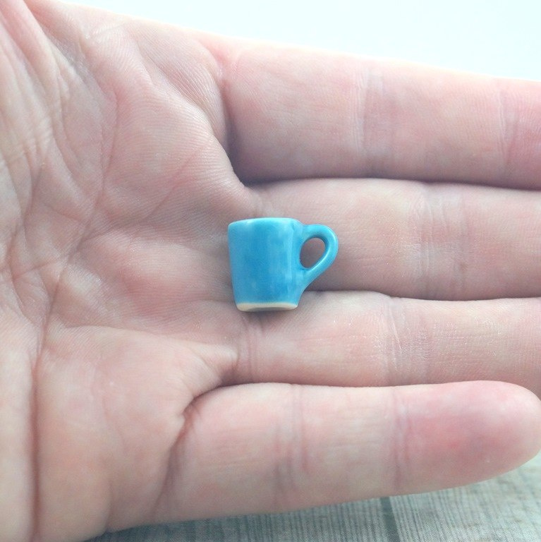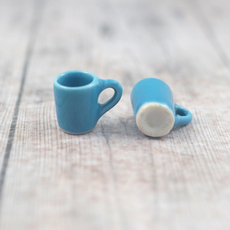 Mini kubeczek ceramiczny z uszkiem w kolorze niebieskim o wymiarach: średnica górna 10mm,średnica dolna 7mm,wysokość 13mm.