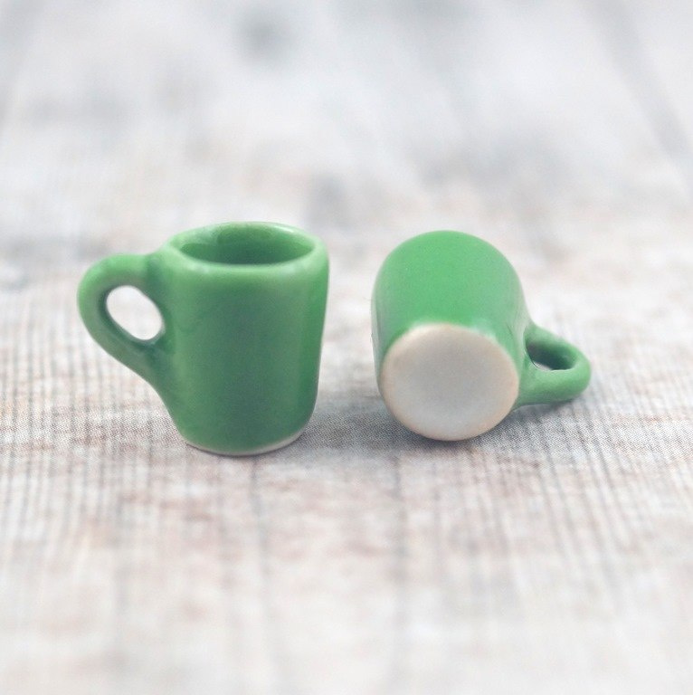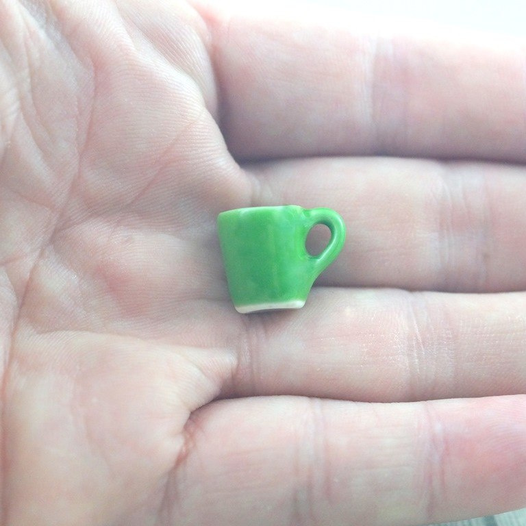 Mini kubeczek ceramiczny z uszkiem w kolorze zielonym o wymiarach: średnica górna 10 mm, średnica dolna 7 mm, wysokość 13 mm.