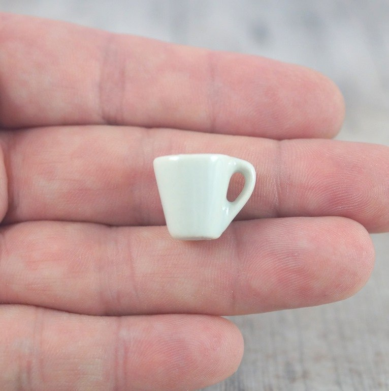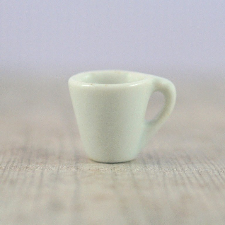Mini kubek ceramiczny w kolorze białym , wysokość 14,3 mm , górna średnica 13 mm , dolna średnica 8 mm . skala domku dla lalek 1:12/