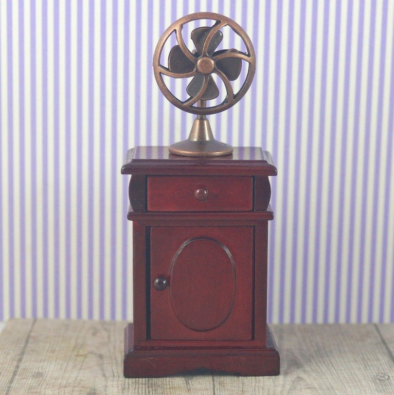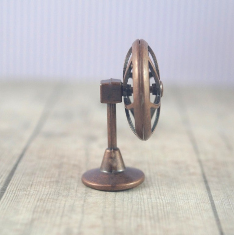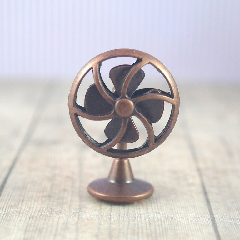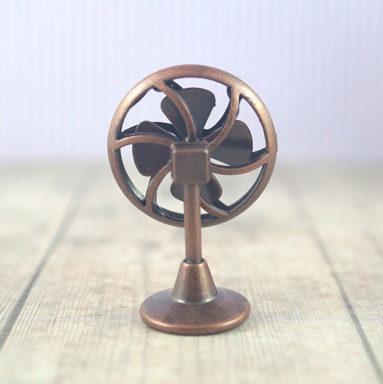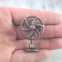 Mini metalowy wentylator w kolorze patynowanej miedzi (ruchomy wirnik) miniatura do domku dla lalek , wysokość 44 mm , średnica podstawy 19 mm , średnica zewnętrzna wirnika 30 mm. Skala domku dla lalek 1/12.