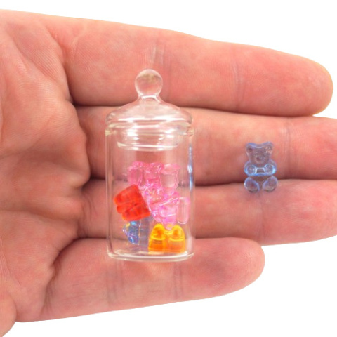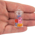 Mini słoiczek szklany z pokrywką , idealny jako wyposażenie kuchni dla lalek - skala 1:12 , wysokość z pokrywką 42 mm , średnica 20 mm . Słoiczek zawiera 6 imitacji żelkowych misiów wykonanych z żywicy o wymiarach 12x8x6 mm. Kolory wybierane losowo.