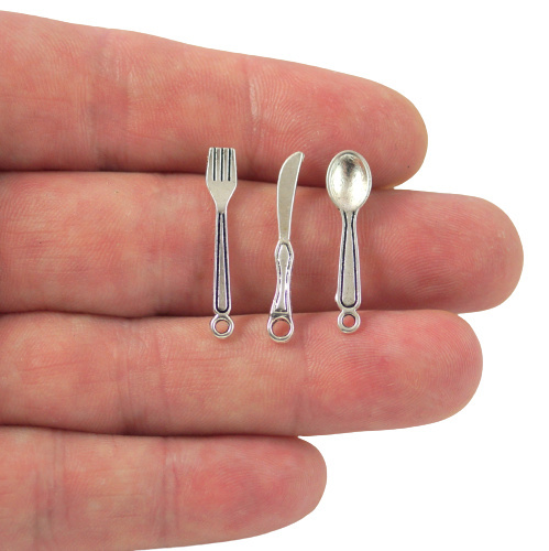 Zestaw obiadowy mini sztućcy w kolorze srebrnym ; łyżka do zupy o długości 24mm ,widelec o długości 24mm , nóż o długości 25mm .