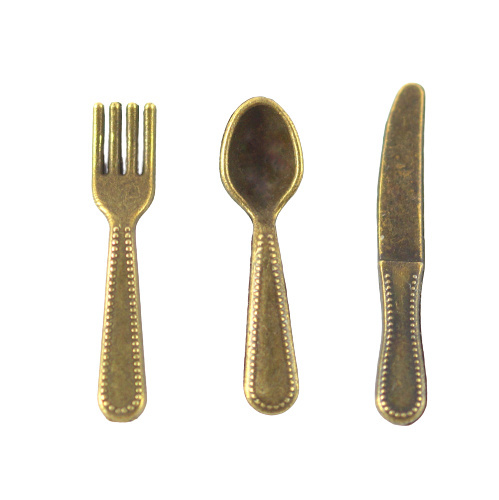 Zestaw obiadowy mini sztućcy w kolorze starego złota ; łyżka do zupy o długości 19mm ,widelec o długości 20mm , nóż o długości 21mm .