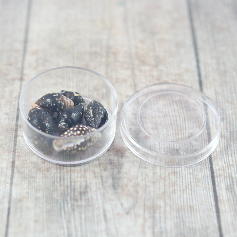 Miniaturowe muszelki czarne zapakowane w pudełeczku idealne do wypełniania kaboszonów ,buteleczek o wymiarach około 10 mm ,11 mm, 12 mm ,13 mm