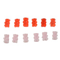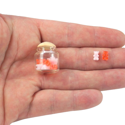 Imitacja miniaturowych słodyczy w szklanym słoiczku. Słoiczek szklany z drewnianą pokrywką o wysokości 22mm i średnicy 18 mm. Zawartość ; miniaturowe imitacje słodyczy wykonane ręcznie z żywicy. Żelkowy miś 6,5x4 mm truskawkowy 4x , Żelkowy miś 6,5x4 mm malinowy 4x .Miniatury idealne jako wyposażenie kuchni dla lalek w skali 1:12.