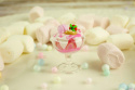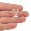 Miniaturowy szklany pucharek do lodów, górna średnica 16 mm, dolna średnica 13 mm, wysokość 19 mm. Miniatura do wyposażenia domku dla lalek w skali 1:12. Na zdjęciach pokazane przykładowe wykonanie imitacji deseru.