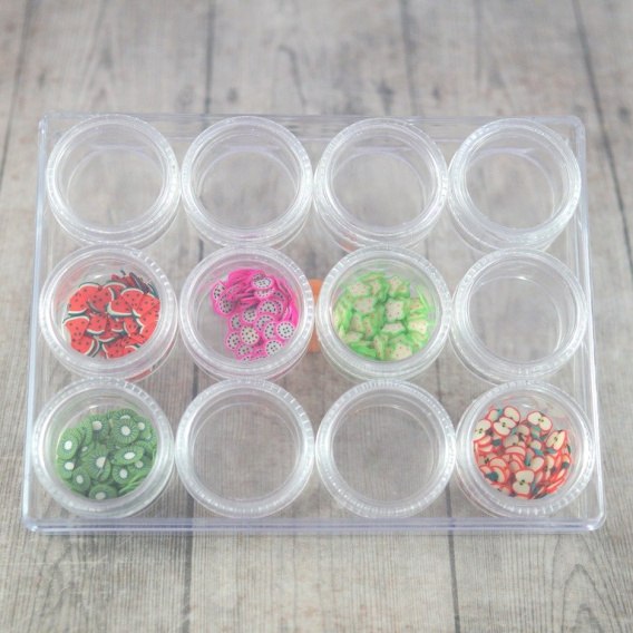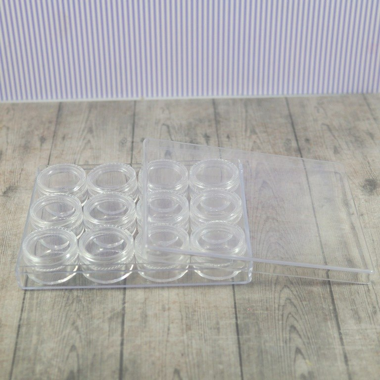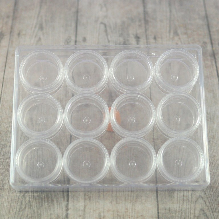 ORGANIZER PROSTOKĄTNY wykonany z plastiku o wymiarach 130x98x22 mm . Organizer posiada 12 odkręcanych pojemników o średnicy 30 mm i wysokości 18 mm. Idealne rozwiązanie do przechowywania drobnych elementów ozdobnych (cekiny , plasterki FIMO)
