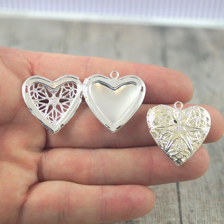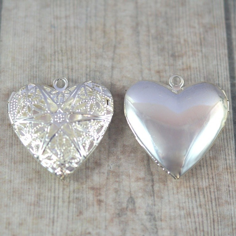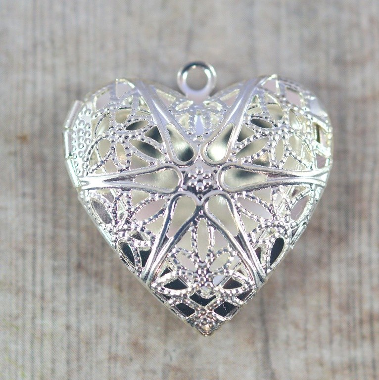 Sekretnik w kształcie serca w kolorze srebrnym, otwierany w lewą stronę ; wymiar 26x26x7 mm ,wymiar wewnętrzny serca (miejsce na fotografie) 19x15 mm,