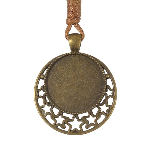 Baza wisiorka do kaboszona 25mm w kolorze starego złota z sznurkiem ozdobmym. Średnica zewnętrzna 36 mm , długość sznurka 80 cm.
