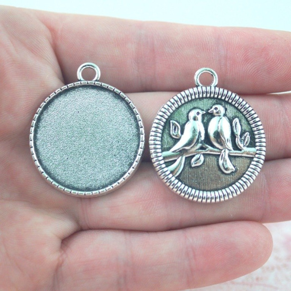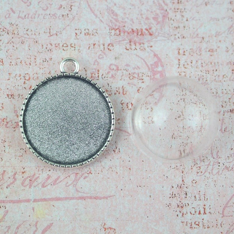 Zestaw zawiera bazę kaboszona w kolorze srebrnym o średnicy całego wisiorka 27,5 mm ,