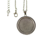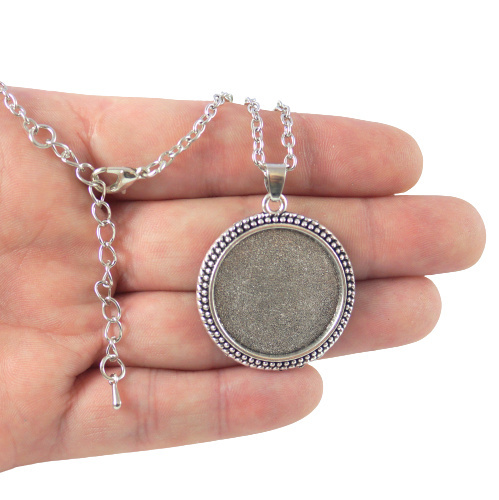 Baza wisiorka do kaboszona 25mm w kolorze srebrnym z łańcuszkiem. Średnica zewnętrzna 32 mm , długość łańcuszka 60 cm.