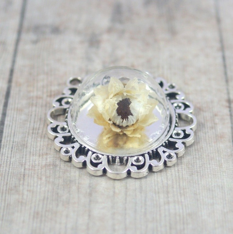 Wisiorek z półkulą szklaną z możliwością wypełnienia miniaturowanymi kwiatkami .